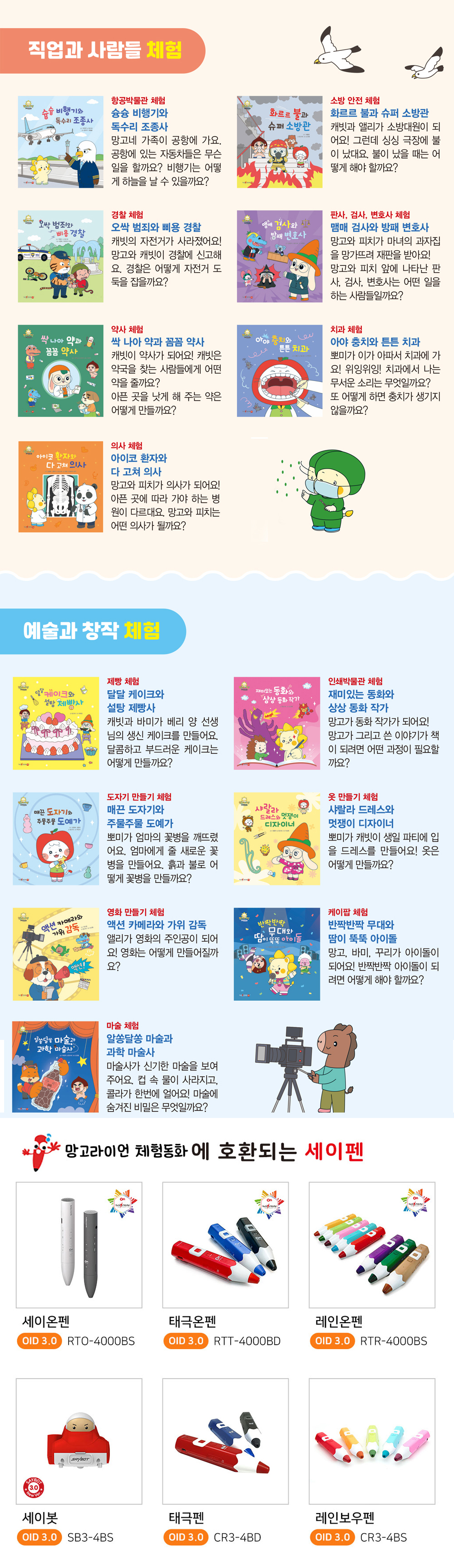 문자인식 광학 센서가 탑재된 첨단 어학기 세이펜을 활용할 수 있는 교재입니다. 특수한 인쇄방식을 사용하여 세이펜으로 책을 읽을 수 있게 코딩하여 인쇄한 교재입니다. 400여개의 출판사의 교재를 세이펜 하나로 모두 사용이 가능하며